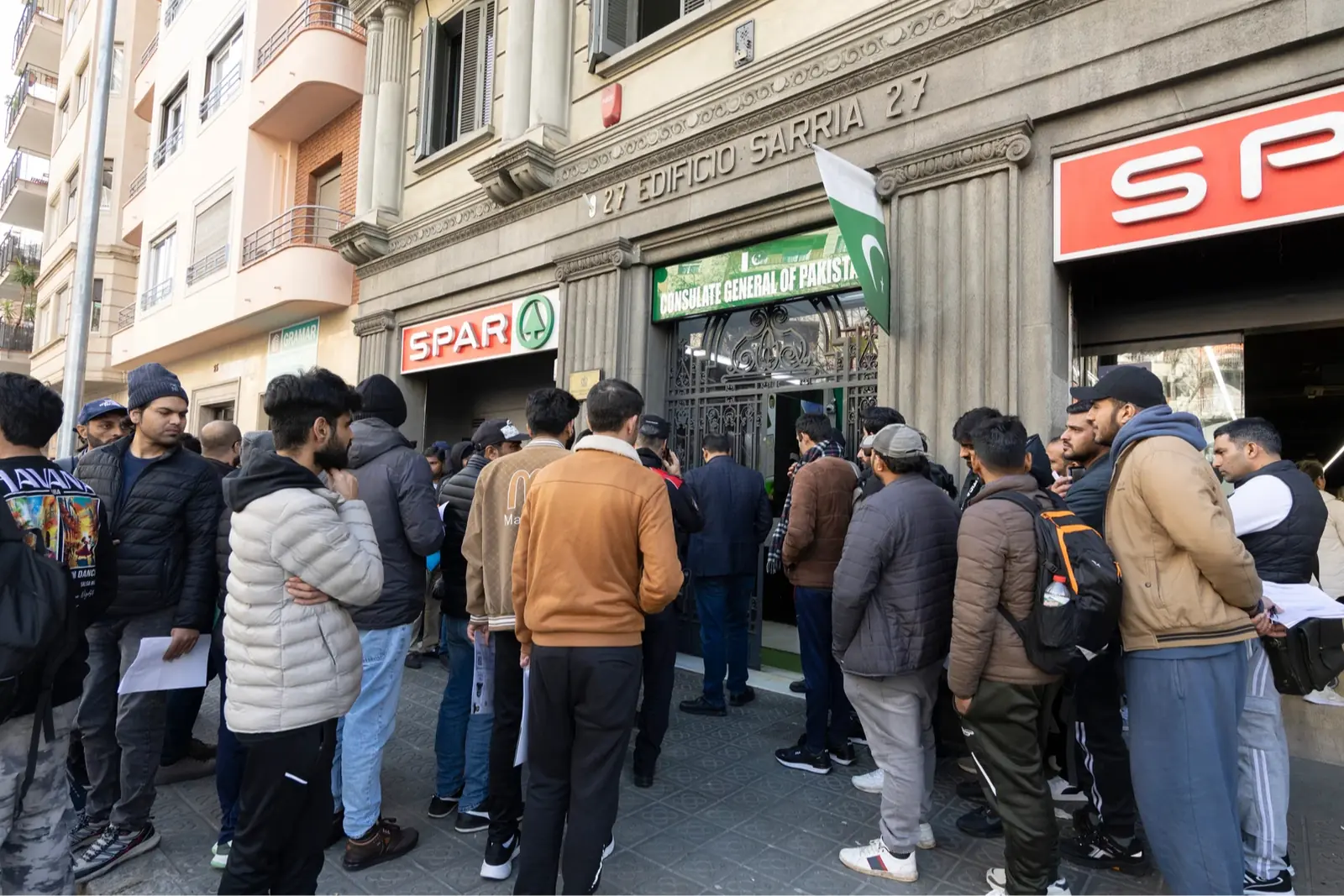 Marroquís frente al consulado. El personal consular ha sido puesto en situación de disponibilidad permanente durante todo el proceso. Los servicios se centran en la legalización de documentos y la gestión de citas necesarias para acceder a la regularización. Toda la información se está difundiendo activamente en webs oficiales y redes sociales.